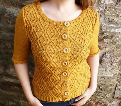 The stitch motif on this cardigan has been inspired by the traditional Japanese embroidery style, Sashiko. It consists of simple little cables, which can be worked without the aid of a cable needle if you’re up to it. It’s an involved but intuitive pattern that produces a stunning effect! The rest of the cardigan is quite simple in contrast - knitted flat, with a scoop neck and half-length sleeves. Smooth merino yarn makes it great springwear.