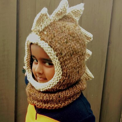 Saurus is a fun hooded cowl you can knit for dinosaur-fans of all ages. It is a fitted cowl, knit in the round, from the bottom-up. The hood portion is knitted back and forth. Spikes are knitted separately and attached