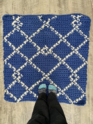 The rug is crocheted using basic crochet stitches and Jumbo #7 yarn in 2 colors. A graph is included along with the written pattern to make it a super easy pattern to crochet. An Instructional video is included to teach you the Intarsia technique of adding and dropping yarn colors to create the geometric design.