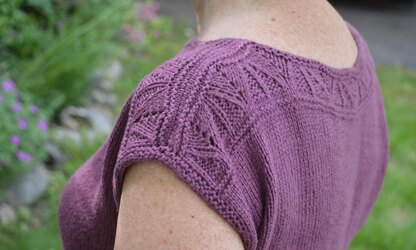 CONSTRUCTION: Front and back are knit separately from the bottom up. Neckline is shaped with short rows, and shoulders are joined with 3-needle bind off. Stitches are picked up for the armband trim, and the sides are seamed.