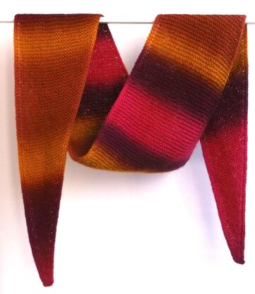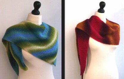These two patterns would suit a confident beginner plus. The red and orange is a garter stitch scarf worked sideways with an I-cord edging that is worked into the pattern as you knit. The blue and green boomerang shaped shawl is again worked in garter stitch with a garter stitch edging.