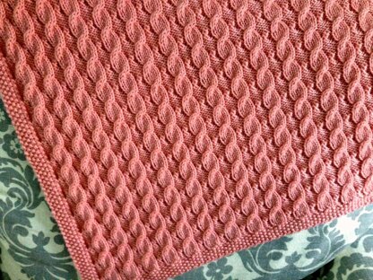This pattern includes written and charted instructions. There is a link to a YouTube tutorial on cabling without a cable needle. The blanket is reversible.