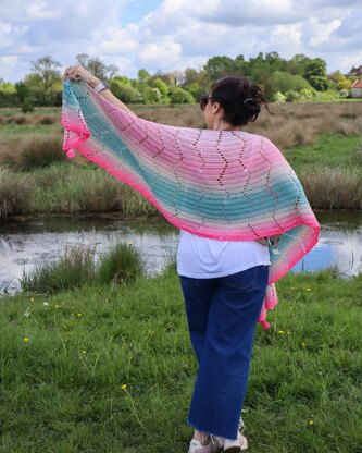 A generous crescent shaped shawl with gently diverging filet crochet zig zags, designed to work at right angles to the colour changes. Note that this shawl is designed to be worn draped over the shoulders, not wrapped around the neck.