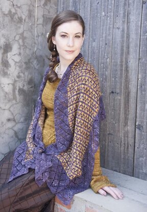 The stole is knit from two colors of fingering-weight yarn. You will need approximately 800 yards for the main color (purple) and 300 yards for the contrast color (gold). The size of the stole may be adjusted, but you will need more or less yarn, depending on the adjustments you make.