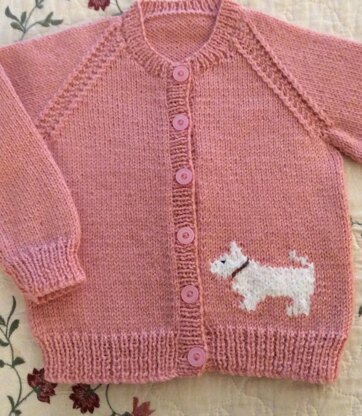 The pattern supplies button fastening for both boys & girls. Don't all little ones just love little dogs? Graphs are supplied for inserting the intarsia design, or it could be embroidered using the Swiss Darning/Duplicate Stitch method.