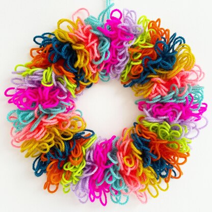 The scrappy loopy wreath is a fun and textured wreath that is not just for Christmas! If made up in colourful non-traditional colours it could hang in your house all year round. This project makes use of your leftover colourful yarn scraps or maybe even mini skeins? It could also be made up in a solid colour, just ignore the colour changes in the pattern.