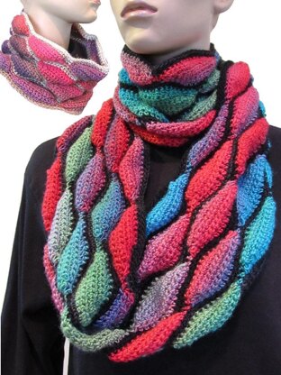 An exciting way to use self-striping yarns in these fashionable infinity cowls in 2 sizes!