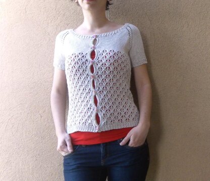 Sea Glass is a seamless, little cardigan mostly worked flat, from the top down with buttoned short sleeves. The garment features the traditional raglan sleeves method and a lovely lace pattern for the body.
