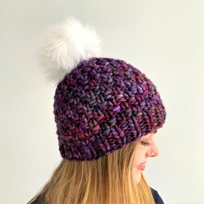 The yarn for this pompom hat reminds me of the beautiful and varied colours of sea glass, and the double moss stitch pattern, (USA moss st), adds a lovely texture. Super-chunky/super-bulky yarn means extra warmth in those cold, winter winds. A fluffy pompom tops it off. There is an option for added slouch, by working extra rows - you still only need 1 ball of Malabrigo Rasta.