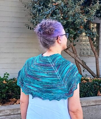 Beginning with a center neck cast on, the shawl features 2 columns of yarn-over increases, plus increases at the edges. The first section is all in garter st, so the knitter will see fast progress. The rest of the shawl uses stockinette stitch with garter stitch ridges, and an easy textured stitch to show off the gently variegated yarn.