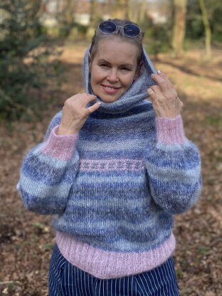 The Sea Mist Pullover is knitted using three colours of Drops Kid-Silk, a luxurious mix of Kid Mohair and Mulberry Silk. The yarn is used double throughout; the ribs using White with Old Pink and the main part using White with Sea Mist. The body has a simple slipped stitch pattern just before the armhole divide. The main body is loose- fitting, with drop shoulders, high rolled neck and slightly puffed sleeves. The front and back are both knitted from bottom up in the round up to the armhole divides. The sleeves are knitted in the round down to the cuff to avoid sewing seams. The Sea Mist Pullover is feather light and silky soft to skin. 4 sizes: S/M, M/L, L/XL, XL/XXL.