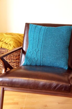 This decorative throw pillow cover features a cable motif down one side of the front and simple stockinette everywhere else. The pillow is worked flat, in one piece. The bottom of the back is worked first in stockinette stitch, followed by the cabled front and finally the top of the back in stockinette again. The sides are seamed, with the top of the back overlapping the bottom. Buttons add a decorative and functional finishing touch.