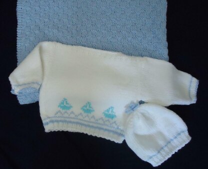 Great style for boys or girls. Includes a good sized blanket of about 32 by 38 inches. A nice easy graph pullover sweater with cute little sail boats! And a hat to match. Wonderfully made with sport weight yarn, called "baby sport", and a 29 inch circular needle size 8 for blanket. For sweater and hat, use US # 5 and 6 needles. This is pretty easy to accomplish, so try one in pink tones for girls too!
