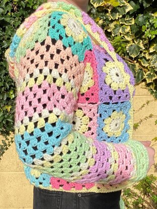The pieces are joined as you go, so there’s no seaming afterwards. The sleeves are worked in the round downwards from the shoulder to the cuff. The hood is worked upwards in one piece and there’s a short seam to close the top of the hood. This seam is worked in ss and can’t be seen, even when the hood is down. This pattern is great for using up yarn scraps.