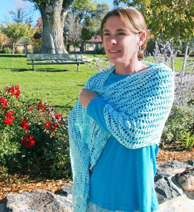 Seaside is crocheted in a lace pattern that gives beautiful drape and flow. The airy shell stitch undulates from narrow to wide and back again to give you the illusion of waves. Edged with a similar pattern this shawl is wide enough to cover you on a chilly day.