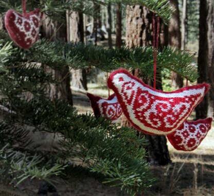 Bird ornaments.  2 designs included in the pattern. Each design comes in 3 sizes. Full colowork chart of the entire bird included for each design and each size.  The ornament is knitted in round seamlessly.