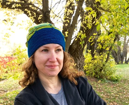 Seastago Hat is worked by using a stretchy cast-on and then joining in the round. A garter st brim is worked on smaller needles, and then a stripe sequence is worked on larger needles. Using needles for small diameters, the crown is decreased until a small number of sts remain, and then the top is cinched up.