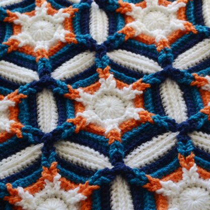 The Seastar Blanket consists of 86 hexagon motifs and 8 partial motifs to fill the gaps at the top and bottom. The motifs are joined as you go, making for minimal finishing. The pattern uses the simplest crochet stitches: chain, single crochet, and double crochet.