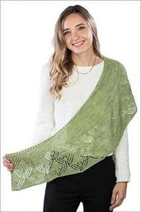 “Second Spring” is a fingering weight, crescent-shaped shawl featuring a leaf lace border. The shawl is worked bottom up, beginning with the lace border, and then knit into a crescent shape using short rows.
