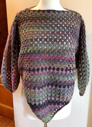 The neck hole is approximately 24 inches around. This top size will fit nicely for someone that wears a medium-large. Row 26 falls at about the waist and measures approximately 43 inches around. You can keep working your poncho until you are happy with it’s size. As you continue adding rows, the triangle will become larger at the top and longer in the center. The triangle poncho shown in the photo is 53 rows.