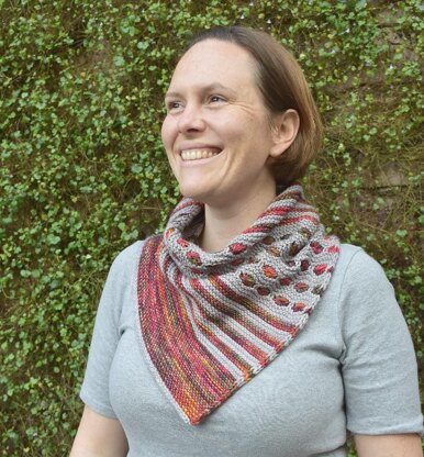 The Cowl is mostly worked in garter st with simple increases and decreases to shape the work. The pattern is created using stripes of colour and the aster stitch to create little pops of colour.