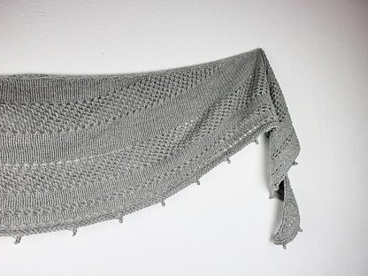**Gauge:**14 stitches and 26 rows in 4 inches (10 cm) in stockinette stitch after blocking. Gauge is not crucial for this project, but changes might result in a smaller/larger shawl and different yardage requirement.