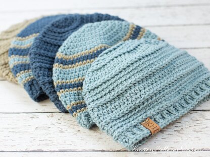 This pattern contains *two* simple men's hat patterns that work up quickly and are great for donating to shelters and organizations that help the needy. Caron One Pound is a thicker worsted weight yarn, so keep that in mind if you decide to substitute. The solid colored hat comes in 5 sizes, and the multi-colored hat comes in 2 sizes.