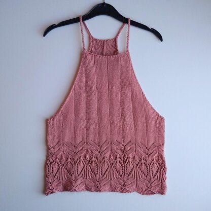 he Seija Racerback is a delicate summer camisole, made using a cotton-bamboo blend yarn. Seija means serene and tranquil, which exactly how I envisage my days spent in the summer sun wearing this top! Seija is worked from the bottom up in the round so that you can work the top as one piece, and avoid any sewing up at the end. You will work the main pattern as one piece to the underarm, and then divide into two parts (for the front and back) and continue the shaping working flat (back and forth) but on the same circular needles. Straps are formed using i-cord technique and attached the back using 3 needle bind off. The top has a high neck and a racerback style on the back.