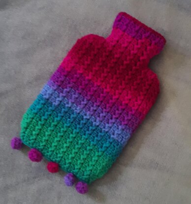 A cabeled hot water bottle cover, with an optional bobble/buttoned opening at the bottom. Instructions are included for a 2.5-liter hot water bottle and a 1.75-quart (2-liter) hot water bottle. Instead of the bottom opening, a side zip can be included to provide easy insertion and removal of the hot water bottle, or alternatively, insert the (rolled-up) hot water bottle through the top opening.