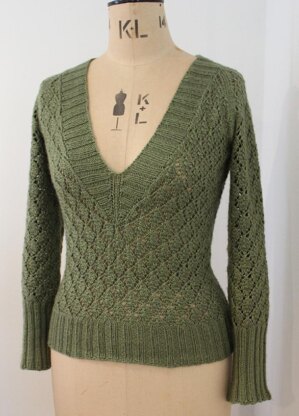 Because the v-neck gives lots of room at the bust and the lace is stretchy, knit one size smaller than your bust measurement.