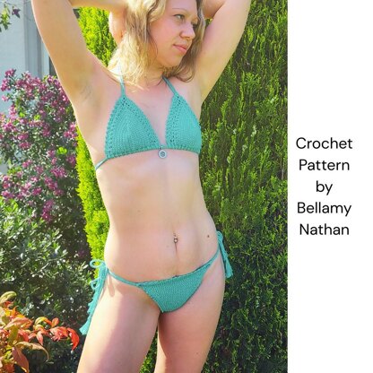 Make your own stunning swimwear with the "Seluna" crochet bikini pattern! This beautiful set features a flattering bra top and thong style bottom that's perfect for beach days and poolside lounging.