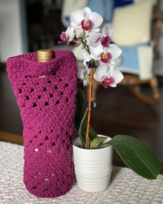 The traditional granny stitch meets seed stitch to create a unique texture. Made with worsted weight cotton yarn, it’s sturdy, easy to care for, and eco-friendly. Your wine will travel in style in the Seneca Wine Bottle Tote!