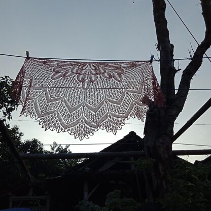 The shawl is adjustable in size by adding the main repeat. The sample is worked in 3 main pattern repeats. Simply add the main pattern repeat for more crescent shape, for maximum 6 repeats (as the shawl will form a full circle in 7 main pattern repeats).
