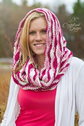 This cowl has a Crystalized twist on the rising popularity of the hooded cowls, an infinity cowl that can also be made with less length if no hood is preferred. The Serene Reflections Hooded Cowl has off set shells make this pattern flow throughout and drift around the face. This stitch combination is perfect for 3 colors, enhancing multiple wardrobe options for anyone over the age of one. Use subtle colors or bright colors, or even a rainbow of colors for an ocean of possibilities.