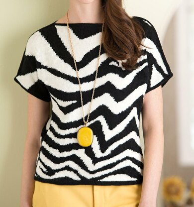 Although the top is simple in principle, there are quite a few techniques used here. The Zebra fabric is produced entirely in intarsia, but additionally techniques include temporary cast on at the welt and Three Needle Cast Off at the shoulders. The shoulders are shaped with short row shaping to give a neater fit at the cuff and the side panels are joined by grafting.