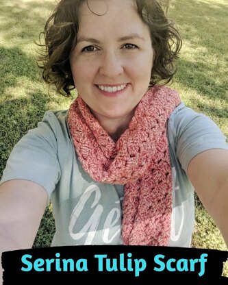 The Serina Tulip Scarf combines offset Double Crochets with intricate chain spaces to create a beautiful scarf perfect for any weather.