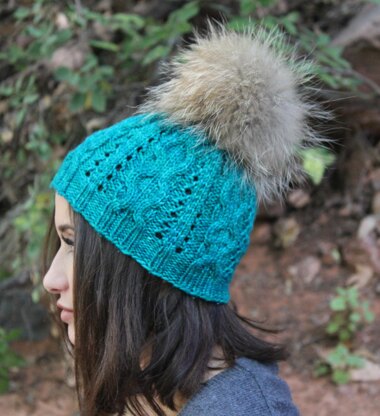 Seven Pools is covered in a lace and cable pattern and has a slouch style. The pattern is written out and charted. The fur pompom can be found in the Etsy shop: Wabarna