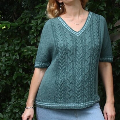 Shailer Pullover is a seamless pullover worked top-down in one piece with saddle shoulders. It has an unshaped silhouette and positive ease about 3 - 4’’ (7-10 cm). It features a V - neck and a beautiful cable panel on the front. This pattern includes both short and long sleeve options.