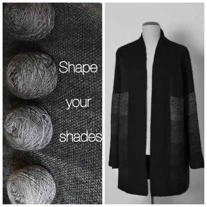 The cardigan is knitted flat from the top down, using 2 strands (fingering and lace weight yarn) held together to achieve this fantastic marled fabric with colour changes.