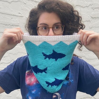 This cowl is knit entirely flat and seamed once finished, and uses intarsia to create the shark and teeth images. Pattern includes both graphs and written instructions for the colorwork.
