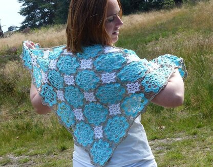 The motifs are joined 'as you go'. The width of the shawl is 128 cm / 50”, the height is 65 cm / 28". I used 3 balls Lana Grossa Aria aquablue (nr 025), 2 balls taupe (003) and 1 white (001).