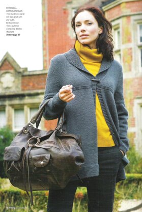 This is a pattern for a long shawl neck cardigan, originally published in Knitting magazine. It is a simple loose shape in stocking stitch with garter stitch edges and collar and a garter stitch detail on the body and sleeves. Photo Laurel Guilfoyle for Knitting magazine.