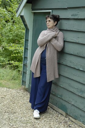 Ribbed wrap coat with one button front fastening, large shawl collar and plain stocking stitch sleeves