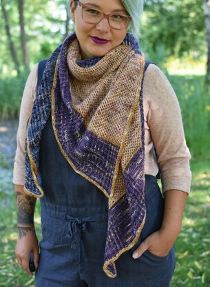 Shawllinn is a deep triangular shawl knit sideways in wide brioche and garter ribs creating a two-color fade, intersected by a large two-color honeycomb brioche stripe. The shawl is surrounded by an i-cord border for a neat and finished look and an extra color pop.