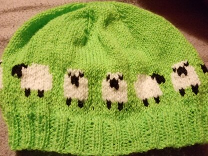 a one size adult beanie hat with delightful sheep walking round and the good thing is you can choose which way you want your sheep to go