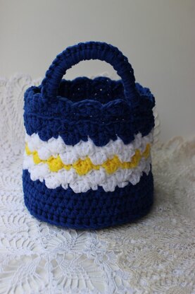 Shell Basket designs with handles, 9” diameter; 8” tall without the handles.
