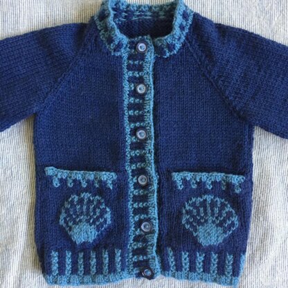 The Shell Seeker Cardigan and Jumper have deep pockets with a clam shell motif and matching bonnet/hat depending on size. They have decorative two colour ribs and optional borders of cockle shells. I used Debbie Bliss Rialto, a warm pure wool in a good range of colours but the pattern works for any double knitting. Instructions range from approximately 1 to 7 years of age.