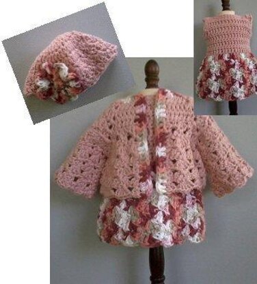 Reminiscent of the 1930's, this 3-piece ensemble for an 18-inch doll was fun to crochet. The dress, which buttons in the back, has a solid-color top and variegated skirt, but can be made in any color combination.
