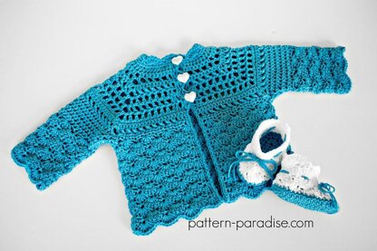 This cardigan sweater and booties are made with soft, feminine shells. Adorned with a pretty swirled rose that can be studded with pearls or other jewels is a perfect ensemble for her first photo shoot.