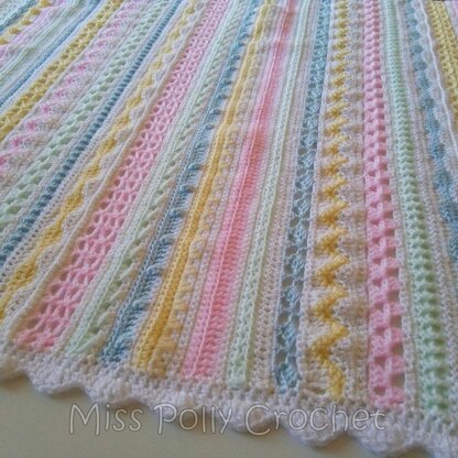 This pretty baby blanket is just the thing to try different stitch patterns and simple colour changes, as well as stash-busting favorite yarns. Whether an experienced beginner or more advanced, this pattern has plenty to entertain. Worked in rows using basic stitches, with eleven repeating stripe stitch patterns. Basic hand drawn stitch charts included.